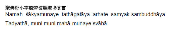 【1、般若心咒:】 揭谛揭谛.波罗揭谛.波罗僧揭谛.菩提萨婆诃 (《心经》专辑点此进入>>) 舍利子。诸菩萨摩诃萨。若能诵是般若波罗蜜多明句。是即修学甚深般若波罗蜜多尔时世尊。从三摩地安详而起。赞观自在菩萨摩诃萨言。善哉善哉。善男子。如汝所说。如是如是。般若波罗蜜多。当如是学。是即真实最上究竟。一切如来亦皆随喜。(摘自《佛说圣佛母般若波罗蜜多经》) 心真言(摘自《佛说观想佛母般若波罗蜜多菩萨经》) 唵(引)曩莫舍吉野(二合)母曩曳怛他(引)誐哆野(引)啰贺(二合)谛(引)三藐三没[馬*犬](引)野怛儞野(二合)他(引)唵(引)母儞(引)母儞摩贺(引)母儞(引)曳(引)娑嚩(二合引)贺。