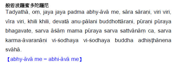 曩莫(入一)舍(引)吉也(二合反二)母曩曳(引三)怛他(去引)誐哆(引)野(引四)[口*栗]喝(二合)帝(引五)三么药(二合反)讫三(二合)没[馬*犬](引)野(六)怛儞也(二合反)他(引八)母[寧*頁](引)母[寧*頁](引九)摩贺(引)母曩曳(引十)娑嚩(二合引)贺(引十) 佛告圣观自在菩萨摩诃萨言。此圣佛母小字般若波罗蜜多真言。一切诸佛由是得阿耨多罗三藐三菩提。 参考发音:母你 母你 嘛哈 母拿耶 司哇哈 【3、般若波罗蜜多陀罗尼(根本真言)】 般若波罗蜜多陀罗尼(摘自《圣佛母小字般若波罗蜜多经》) 怛儞也(二合反)他(引一)唵(引二)惹(仁左反下同)野惹野(二)钵讷么(二合引)避(引三)遏嚩(无可反)铭(引四)萨啰(来假反下同)萨哩抳(尼贞反下同五)尾哩尾哩(六)尾啰(引)尾哩(七)企哩企哩(八)儞嚩哆(去)弩(鼻音九)播(引)攞[寧*吉](宁吉反十)没度(引)哆(引)啰抳(十一)布啰抳(十二)布啰野(十三)婆(去)誐嚩(武末反)帝(十四)萨[口*栗]嚩(二合引)[口*商](引十五)么么(此处称名十六)布啰野(十七)萨[口*栗]嚩(二合)萨怛嚩(二合引)难(上)左(十八)萨[口*栗]嚩(二合)嚩[口*栗]么(二合引十九)嚩啰拏(引)[寧*吉](二十)尾戍(引)驮野(二十一)尾戍(引)[馬*犬]野(二十二)没[馬*犬](引)地瑟姹(二合引)[寧*頁]曩(引二十三)娑嚩(二合引)贺(二十四引) 佛告圣观自在菩萨摩诃萨。此胜妙法般若波罗蜜多陀罗尼。是能出生一切诸佛菩萨之母。若有众生暂闻是法。所作罪障悉皆消灭。此法一切诸佛及众菩萨。经百俱胝劫说其功德不能得尽。若能受持读诵此陀罗尼者。便同入一切曼拏攞中得受灌顶。又如受持一切真言皆获成就。 根本真言(摘自《佛说观想佛母般若波罗蜜多菩萨经》) 怛儞野(二合)他(引)唵惹曳(引)惹曳(引)钵纳摩(二合引)鼻阿嚩弭(引)阿嚩弭(引)娑啰娑罗尼地里地里啰(引)地里地啰(引)地里儞嚩哆(引)努波(引)罗儞没度(引)哆(引)啰尼布啰野布啰野婆誐嚩底萨里嚩(二合引)舍(引)摩摩波里布啰野娑波里嚩啰写萨里嚩(二合引)萨怛鑁(二合)左萨里嚩(二合)迦里摩(二合引)嚩啰拏儞尾输[馬*犬]野尾输[馬*犬]野没[馬*犬](引)地瑟姹(二合引)儞曩娑嚩(二合引)贺(引) 【4、般若波罗蜜多真实圆义陀罗尼】 摘自《圣八千颂般若波罗蜜多一百八名真实圆义陀罗尼经》 怛[寧*也](切身)他(引一句)唵(引)钵啰(二合)倪(引)钵嚩(二合)倪(引二)摩贺(引)钵啰(二合)倪也(二合引)婆(引)西(引三)钵嚩(二合)倪也(二合引)路(引)葛葛哩(四)阿倪也(二合引)那尾[馬*犬]摩泥(五)悉提(引六)苏悉提(引七)悉奠睹弥(引)婆誐嚩底(八)萨哩嚩(二合)三钵怛野(九)萨哩网(二合)誐孙奈哩(十)薄讫底(二合)嚩蹉梨(引十一)钵啰(二合)萨(引)哩多诃萨底(二合引十二)摩(引)说(引)萨那葛哩(十三)底瑟姹(二合)底瑟姹(二合十四)绀波绀波(十五)左罗左罗(十六)誐嚩誐嚩(十七)誐哩惹(二合)誐哩惹(二合)(十八)阿(引)誐蹉阿(引)誐蹉(十九)婆誐嚩底摩(引)尾蓝摩莎(引)贺(引二十)提(引二十一)纥凌(二合引二十二)室凌(二合引二十三)率噜(二合)(引)底(二十四)三蜜哩(三合)底(二十五)尾惹曳(引)莎(引)贺(引二十六) 此陀罗尼秘密章句若常忆念受持读诵者。所获功德不可称计。 最后一句参考发音:嗡ong,赫利 地伊 薛唎 薛鲁迪 斯蜜哩底 V加耶 司瓦哈 以下摘自《修习般若波罗蜜菩萨观行念诵仪轨一卷》收在《大正藏》第二十册613至614页。 般若波罗蜜多根本真言曰 曩谟婆(去)誐嚩戴(引)钵啰(二合)枳娘(二合)播(引)啰弭跢(引)曳唵纥哩(二合入引)地(入引)室哩(二合入引)戍噜(二合)底尾惹曳娑嚩(二合引)诃(引) 参考发音:那摩巴噶瓦迪 叭啦吉娘 叭啦弥打耶, 嗡 赫利 地伊 薛唎 薛鲁迪,V加耶,司瓦哈 此根本真言又名“仁王护国心咒”、“般若无尽藏陀罗尼”。佛言此陀罗尼印有四种名。一名般若无尽藏。二名般若眼。三名般若根本。四名金刚般若心。此陀罗尼印有大功德。若能至心如法受持。随诵一遍出生一万八千修多罗藏。又彼一一修多罗藏中。各各出生二万五千修多罗藏。又彼一一修多罗中。出生百万修多罗藏。又彼一一修多罗中。出生无量百千万亿那由他阿僧祇修多罗藏。如是乃至展转。出生无量无尽修多罗藏。 ======================================= 佛说圣佛母般若波罗蜜多经 ============================ 心经: