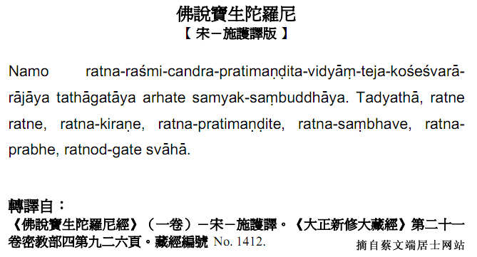 那摩 啦达那 啦时米 坚得啦 钵啦滴曼滴打 尾(念wi)得氧 得(念dei)加 郭(go)斜时哇啦 啦加呀 打他嘎达呀 啊惹哈得(念dei) 三藐三布打呀 打滴呀他 啦达内啦达内 啦达那给(念gi)啦内 啦达那 钵啦滴曼滴得(念dei) 啦达那 桑巴伟 啦达那钵啦贝 啦达诺德 嘎得(念dei) 司哇哈 【短咒】——从“打滴呀他”(即说咒曰)之后开始。 啦达内啦达内 啦达那给(念gi)啦内 啦达那 钵啦滴曼滴得(念dei) 啦达那 桑巴伟 啦达那钵啦贝 啦达诺德 嘎得(念dei) 司哇哈 ==== 可以在诵几遍全咒后多诵短咒! 《佛说宝生陀罗尼经》 曩谟(引)啰怛曩(二合)啰湿弥(二合)赞捺啰(二合)钵啰(二合)底曼尼哆尾儞焰(二合)帝(引)惹具世湿嚩(二合)啰(引)罗(引)惹野怛他(引)誐哆(引)野(引)啰贺(二合)帝(引)三藐三没驮(引)野怛儞也(二合)他啰怛儞(二合引)啰怛儞(二合引)啰怛曩(二合)吉啰尼啰怛曩(二合)钵啰(二合)底曼腻帝啰怛曩(二合)三婆尼(引)啰怛曩(二合)钵啰(二合)鼻(引)啰怛努(二合引)讷誐(二合)帝(引)娑嚩(二合引)贺(引) 若有众生。于此如来陀罗尼名号受持供养。彼人生生得转轮位。成就梵行具大神通。获十种陀罗尼。复值恒河沙等诸佛如来而无虚妄。经俱胝劫不入轮回路。不断菩提种不失菩提心。永灭一切罪得报身如来。若人持诵满一七日。是人当得天眼清净。若人耳闻恒复忆念。是人决定当得菩提。于过去世所作善根亦得现前。若传一人所有无间罪业。悉得除灭永断轮回。是人不被水火盗贼之所侵害。而复诸根不缺众病不生鬼魅不着。众所爱敬于当来世受持如来微妙之法供养诸佛。若人闻已心喜礼拜赞叹。是人功德无量无边。于生生中口出妙香广一由旬。身毛孔中恒有光明常自照曜。常作如来胜利之事如阿难陀。具如是不可思议功德。 ========== 【直译版】(根据字面直接注音,与原音的差别会比读梵音大) 曩谟啰怛曩啰 湿弥赞捺啰 钵啰底曼尼哆 尾儞焰帝 惹具世湿嚩啰罗惹野