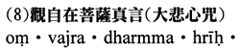 按:本咒又名“大悲心咒”,是一种大悲心的流露,是“于无边有情深起悲愍”。不可等同于常诵咒语“大悲咒”的“心咒”。大悲心咒是起“大悲心”的咒,不是“大悲咒”的心咒。 本咒出处: ─《无量寿如来观行供养仪轨》。《大正藏》第十九册页71上。诵此咒,即自身同观自在菩萨等无有异。 参考现代发音:嗡ong,,哇加啦,达尔嘛,赫利 一、摘自《无量寿如来观行供养仪轨》 观自在菩萨真言曰。 唵(引)嚩日啰(二合)达磨纥哩(二合入引) 由结此印及诵真言加持故。即自身同观自在菩萨。等无有异。 二、摘自《瑜伽集要焰口施食仪》 次入观音定(即入观自在菩萨三摩地。闭目澄心观想自身。圆满洁白犹如净月。在心净月上想◇字放大光明。其字变成八叶莲华。于华台上有观自在菩萨。相好分明。左手持莲华。右手作开敷叶势。是菩萨作是思惟。一切有情身中。各具有此觉悟之华。清净法界不染烦恼。于莲华八叶上。各有如来入定跏趺而坐。面向观自在菩萨。项佩圆光身如金色光明晃耀。想此八叶莲华。渐舒渐大量等虚空。即作如是思惟。以此觉华照触如来海会。愿成广大供养。若心不移此定。则于无边有情深起悲愍。以此觉华蒙照触者。于诸苦恼悉得解脱等同观自在菩萨相好。即想莲华渐渐收敛量等己身。 则结观自在菩萨印加持四处。所为心额喉顶。每于印处成[口*紇]哩字。其印以二手外相叉。二头指相拄如莲华叶。二大指并竖。即诵观自在菩萨真言曰) 次入观音三摩地 澄心闭目观心中 唵(引)斡资啰(二合)塔啰麻(二合)纥哩(二合) (由结此印诵真言。加持心额喉顶故。即自身等同观自在菩萨。正入定时念赞叹) 相关栏目:咒语