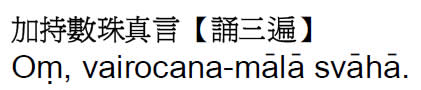 现代参考发音:嗡ong,蓝ram 《显密圆通》 又金刚顶念珠经偈云。若安顶髻净无间。由戴顶上灭四重。手持臂上除众罪。能令行人速清净。又一字顶轮仪说。若用嚂字真言加持数珠七遍。用持课时。一遍或千遍。若掏数珠至母珠。却回不得越过母珠)每日依法持诵时。